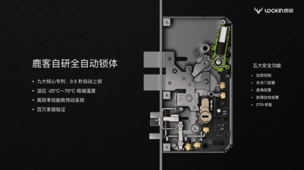 新品S50M采用了鹿客科技自研的全自动锁体,拥有9项核心专利,集5大安全功能于一身,可以秒速自动开门,关门后0.5秒自动上锁,无需门前等待,代表了业内全自动锁体的最高技术水准。