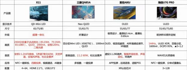 TCL X11搭载的是在Mini LED基础上融入QLED量子点技术的QD-Mini LED技术,不仅有OLED具备的超高对比度,也具有QLED的超高亮度、色域和寿命。所以相对于三星QN85A采用的Neo QLED显示技术、索尼的A80J采用的OLED显示技术、海信U7G PRO采用的ULED显示技术,TCL X11的QD-Mini LED技术更具领先性和碾压性!