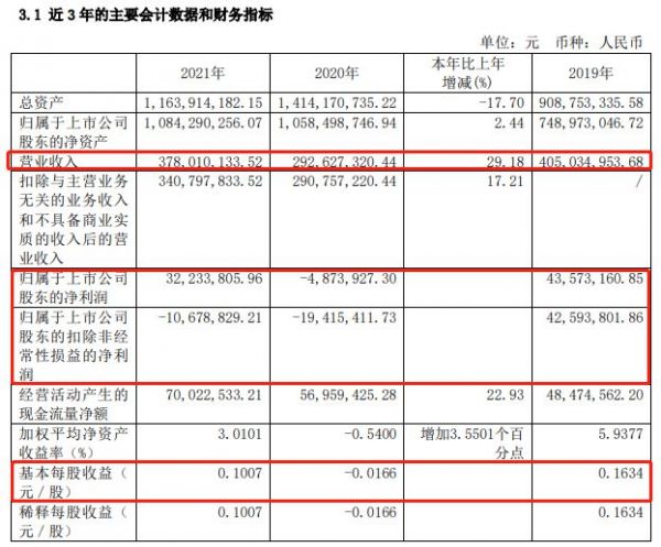 2022年4月14日,广东四通集团股份有限公司(603838.SH) 发布2021年年度报告。据公告,四通股份2021年实现营业收入约3.78亿元,同比增长29.18%;归属于上市公司股东的净利润约3223万元;归属于上市公司股东的扣除非经常性损益的净利润亏损约1068万元;基本每股收益0.1007元/股。
