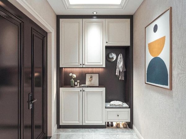 很多家庭只在玄关处安装一盏灯照明,但由于是顶光,日常翻找鞋物就会出现背光的情况,很影响生活品质。我们可以玄关柜中部、鞋柜底部、门镜后方等区域使用灯带,对空间进行提亮,如果家里安装的是掩门柜,可以直接安装感应灯带,鞋柜门一拉开灯就自动亮起,更加方便实用。