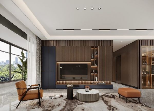 在客厅墙面定制整墙电视柜,并设计成半开放式,展示和收纳兼备,内嵌电视也不会占据空间,轻松提高空间利用率,还可以在沙发背景墙定制柜体,进一步增加储物空间。
