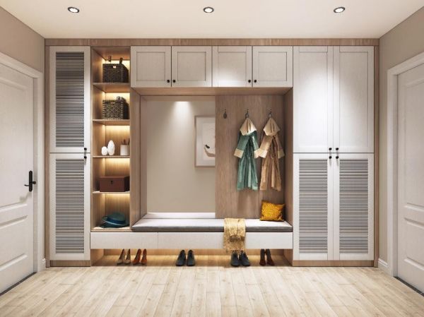 在玄关处定制卡座代替换鞋凳,下面做成开放格,不用开合柜门,就可以直接脱鞋换鞋。闭合式设计也可以收纳鞋油、鞋刷等物品,方便出门时打理。相比于独立的换鞋凳来说,卡座设计在视觉上也更完整统一,可以给客人留下一个好的第一印象。