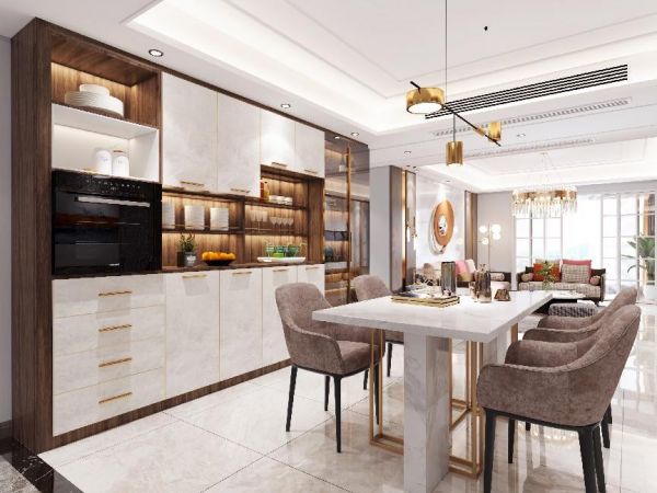 没有餐边柜,餐桌就容易变成“杂物堆”,你会在餐桌上看到剩菜、纸巾、水杯.......甚至玩具的身影,做定制的时候考虑在餐桌旁设计整墙餐边柜,不仅可以承担储物功能,减轻餐桌负担,还能提高空间美感,让居室看起来更干净整洁。
