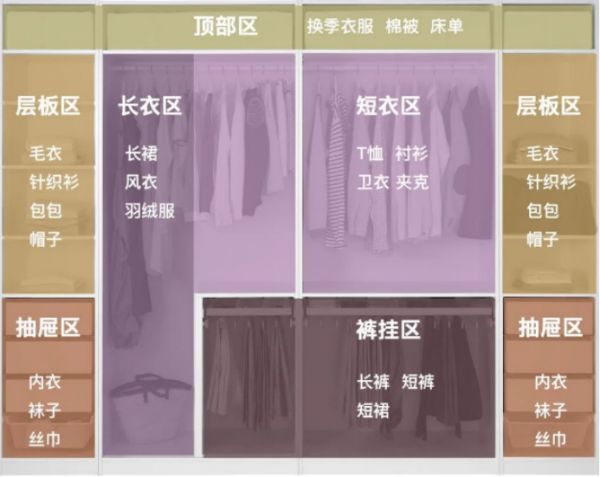 衣柜如果没有做分区,衣服、裤子、被褥等等都混在一起,找衣服需要“翻箱倒柜”,很不方便。在定制衣柜设计时,要提前根据不同衣物的长短、季节、穿搭频率来规划好挂衣区、叠放区、抽屉区、被褥区等等,分类清晰了,找物也会轻松很多。