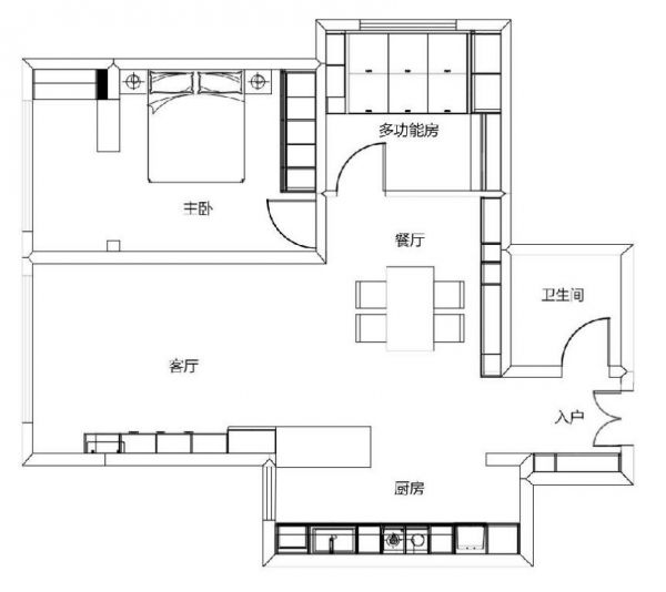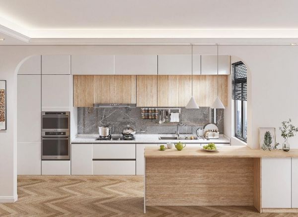 盛女士平时一人独居,但偶尔也有朋友前来聚餐,相较于封闭厨房,盛女士更喜欢开放厨房的自由交流感,所以在这里打掉了厨房与客厅间原本的隔断墙(非承重墙),变封闭厨房为开放厨房,内嵌式家电节约空间,改造门洞变为圆弧形,圆润流畅,更显温柔。同时为了让空间保持连贯的视觉呈现,设计师将客厅的储物柜台面延展到了厨房并与墙体连为一体,作为厨房的补充台面,可当备餐、出餐台使用,让烹饪、用餐都更方便。