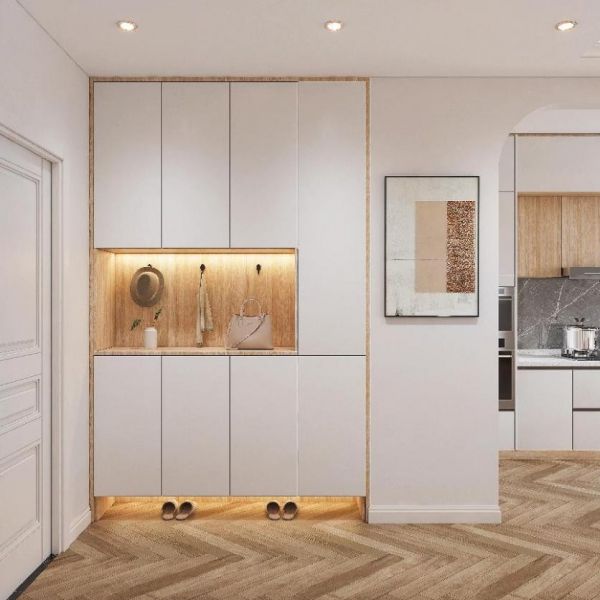 进门处定制玄关柜,不占空间,简约大方。中部留出置物格,可挂、放出入常用物件,底部留空可以放置穿着频繁的鞋子,也更方便清理打扫;闭合柜门无把手,干练大气;两个镂空部分均安装了内置灯带,方便物品拿取的同时,用灯光营造出温馨氛围,让人一进门就感受到温暖。