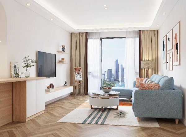客厅以奶油白+土耳其褐木作为主色调,配以灰蓝色小沙发作为点缀,整体清新自然,客厅空间虽然不大,但温馨简约。为了保证客厅的通透感,设计师没有像其它大户型家庭定制整墙电视柜,只用了一个悬空式电视柜和小矮柜承担储物功能,再增加两块墙面隔板作为展示区,减轻了拥挤感,带来轻巧灵动的视觉观感。
