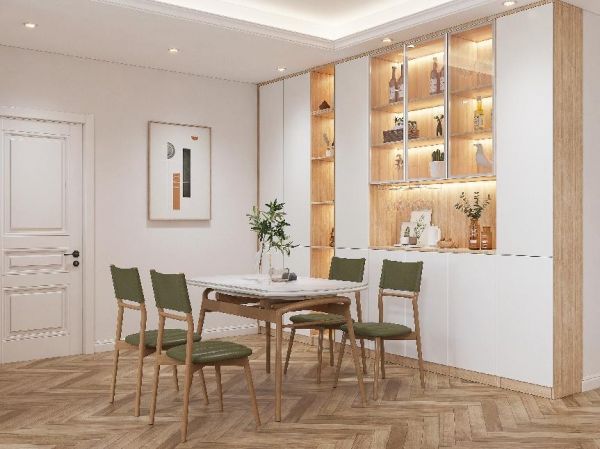 餐厅靠墙定制顶天立地式餐边柜,半开放式设计,展示与收纳兼备,丰富储物量承担了客厅、餐厅、厨房的大部分收纳需求;部分透明柜门设计,使整墙柜体更通透自然。餐桌椅以栗木+深绿色搭配,恰到好处地展现出自然的北欧风情。