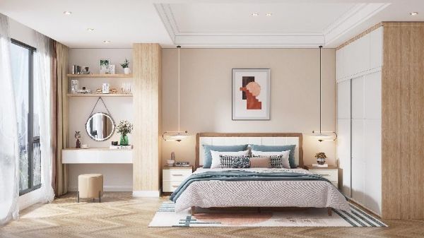 主卧以整墙闭合式衣柜,轻松收纳盛女士四季的衣物,自然的木纹肌理与奶油白搭配,营造温暖舒适的入眠氛围。原本主卧中有一根非常明显的承重柱,设计师通过在承重柱旁的主卧阳台定制悬空式梳妆台,巧妙地将承重柱进行了包裹,化解柱体在整个空间中的突兀感,也满足了盛女士日常梳妆需求。