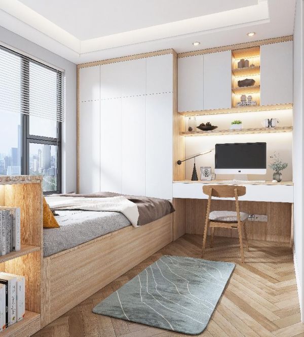 多功能房空间较小,设计师在这里利用定制榻榻米、定制衣柜、一体式书柜+书桌,打造出集书房、次卧为一体的空间,满足睡眠、收纳、工作、娱乐多重需求。延续全屋的奶油+原木色搭配,营造出舒适轻松的工作、睡眠氛围,温暖惬意。