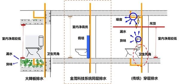 相比传统的穿层排水系统,金茂健科的同层排水系统具备室内净高优,噪声低,卫生死角少等优势。而在卫生防疫方面避免了卫生间横支管穿越楼板,极大降低了细菌病毒在住户间传播的几率,从根本上保证了住户的居住健康。同时同层排水系统采用了优质HDPE(高密度聚乙烯)管材与管件,使排水系统具有很好的耐腐蚀性能和耐温性能。
