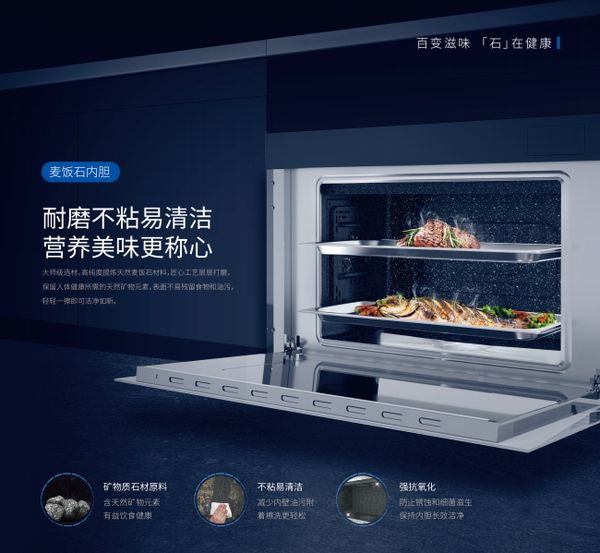 值得一提的是,麦饭石是一种自然的硅酸盐矿物,是具有一定生物活性的复合矿物和药用岩石。相较于市面上的不锈钢或者搪瓷内胆而言,采用该材质的蒸烤箱除了带来更健康的烹饪方式,也有着更好的防污能力,更出色的抗氧化、耐腐蚀效果。