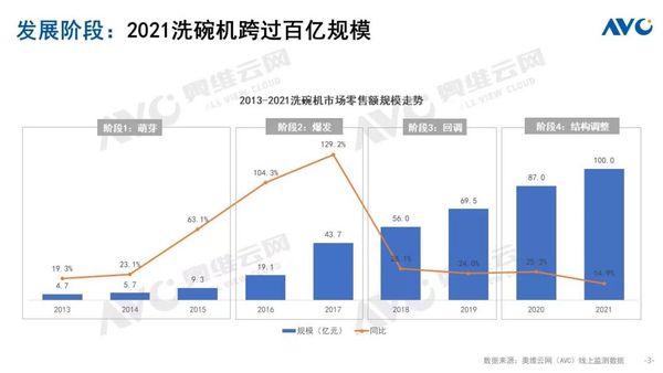 根据奥维云网(AVC)发布中国洗碗机市场年报显示,2021年中国洗碗机市场零售量195.2万台,同比增长1.7%,零售额达99.6亿元,同比增长14.4%,也是去年厨电市场为数不多实现逆势增长的品类之一。
