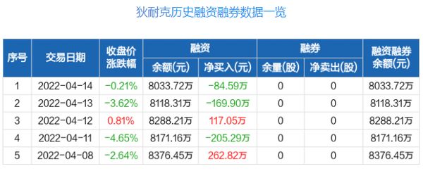 新浪家居智能家居频道讯 狄耐克融资融券信息显示,2022年4月14日融资净偿还84.59万元;融资余额8033.72万元,较前一日下降1.04%。