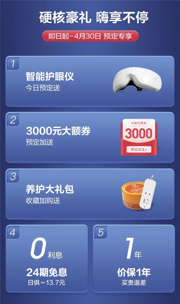 即日起预定开启,4月30日20点火爆开抢,享新品30天免费体验、终身质保、1年保、24期免息等等,还有更多重惊喜豪礼等你来拿!