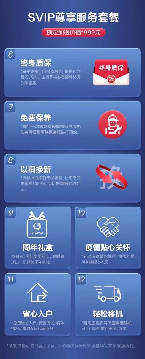 本次新品发售还送价值1999元的专享“SVIP高端服务套餐”,包括终身质保、免费上门保养、支持以旧换新、奥佳华定制周年礼盒、免费送货入门服务,以及疫情地区可享额外防疫暖心大礼包!
