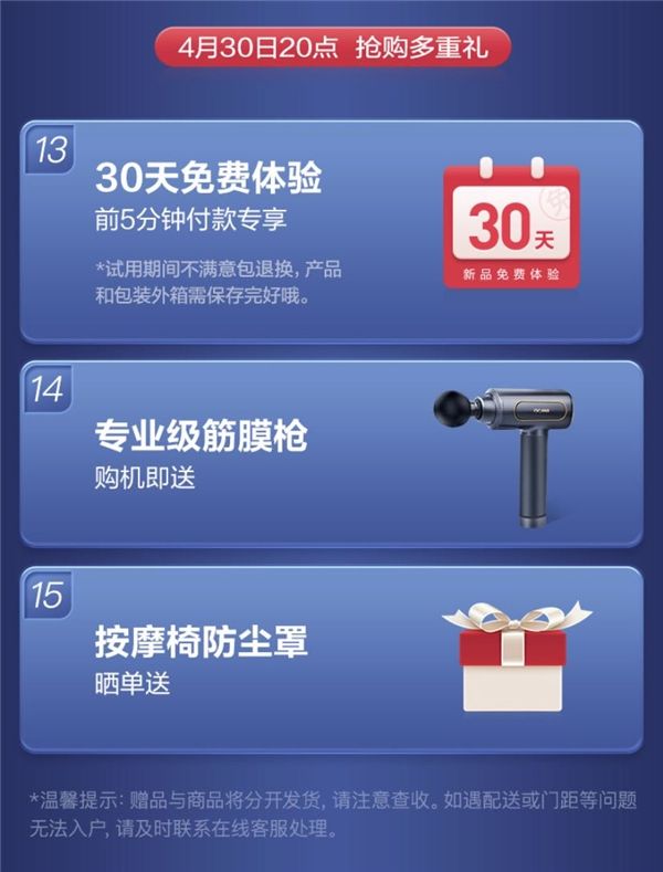 4月30日20点起火爆开抢,前5分钟购机可得“新品30天免费体验”的限时惊喜。只要下单购机即可得到健身塑形好伴侣——专业级筋膜枪一台,参与晒单还送按摩椅防尘套。