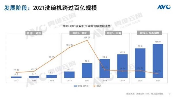 根据奥维云网(AVC)发布中国洗碗机市场年报显示,2021年中国洗碗机市场零售量195.2万台,同比增长1.7%,零售额达99.6亿元,同比增长14.4%,也是去年厨电市场为数不多实现逆势增长的品类之一。