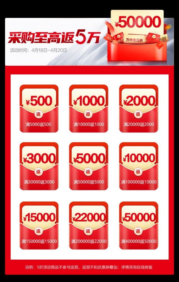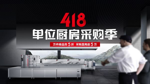418单位厨房采购季期间,单位厨房设备采购满5000返500,满10000返1000,满20000返2000,满30000返3000,满50000返5000,满100000返10000,满150000返15000,满200000返22000,满400000返50000。