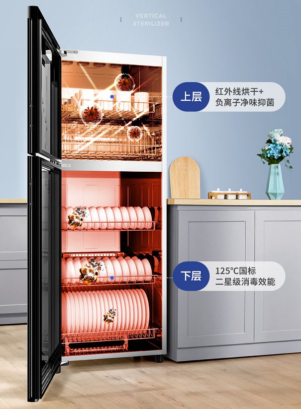 这款消毒柜采用独立双模,上室采用红外线烘干+负离子净味抑菌。红外线灭菌不留情,负离子深度抑菌,净化异味,结合2种工作方式的优势,取长补短,全方位守护家人饮食健康。