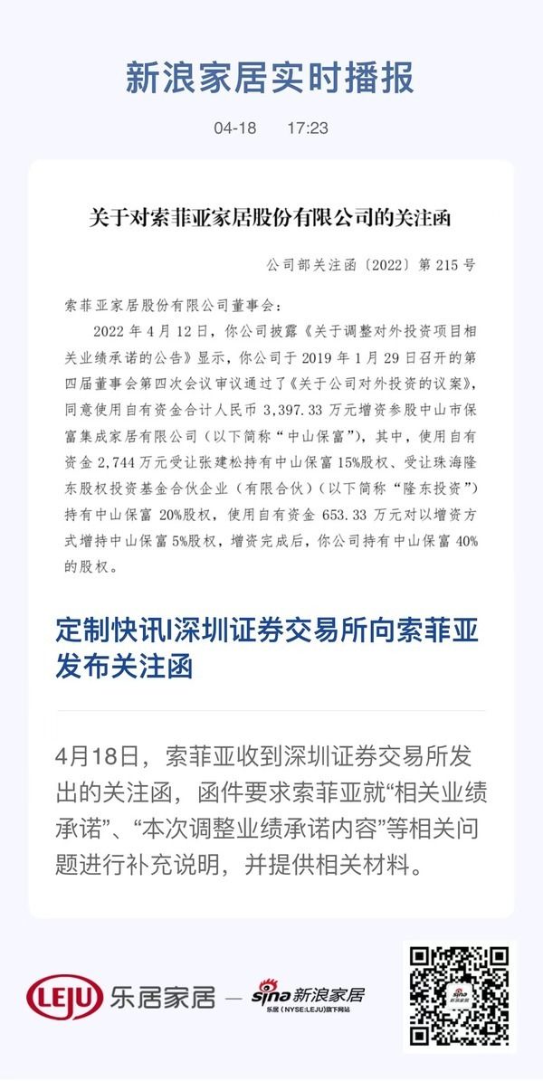 新浪定制频道讯 4月18日,索菲亚收到深圳证券交易所发出的关注函,函件要求索菲亚就“相关业绩承诺”、“本次调整业绩承诺内容”等相关问题进行补充说明,并提供相关材料。