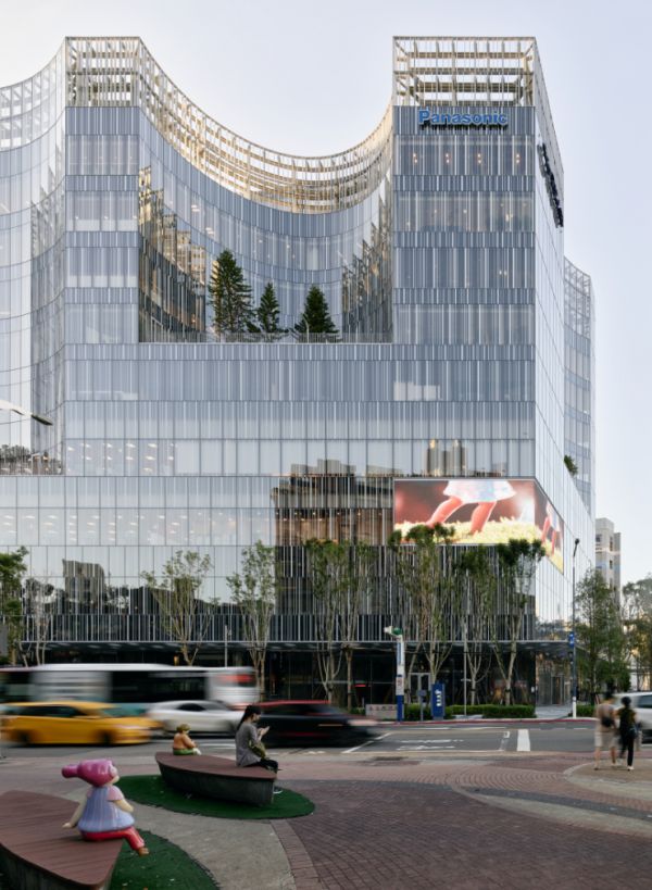 量体设计企图在立面造型呼应老树,创造出垂直深凹绿地及花园,并将深凹孤型花园的设计意象带入城市光廊中,3M的出簷雨遮,提供室内外之间的缓冲空间,并於夜间提供人行步道照明,串连各期基地,临三面计画道路侧提供了10M以上的退缩空间,结合现有人行步道,塑造出双排林荫的步行系统,填补了都市救灾及市民休憩的空间,树荫下的街道家具,让人与人之间的交流,串联起生活的休閒便利性。