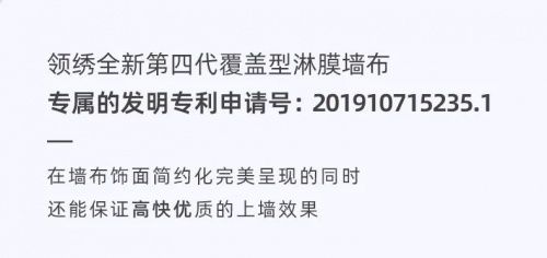 领绣全新第四代覆盖型淋膜墙布产品,为家居软装行业首先采用热熔淋膜(发明专利申请号2019107152351)技术的单层复合面料产品,领绣集成墙板新品同样采用了此项专利技术,其最大优势就在于不添加增塑剂、增粘剂,更加环保健康。高品质生活是当下年轻消费者的普遍追求,坚持以更高科技、更高品质产品满足消费者需求,是领绣墙布一直以来始终不变的宗旨。