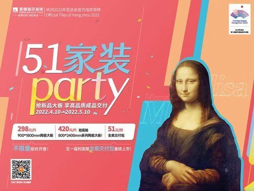 优惠正当时!2022年4月10日—2022年5月10日蒙娜丽莎“五一家装party”,900×1800mm规格的陶瓷大板推出超值价,同时推出专注解决消费者从购砖、设计、铺贴、清洁到售后等一系列难题的高品质成品交付系统,让消费者一站式畅享无忧家装,具体详情可咨询蒙娜丽莎各大门店,了解更多的优惠政策!