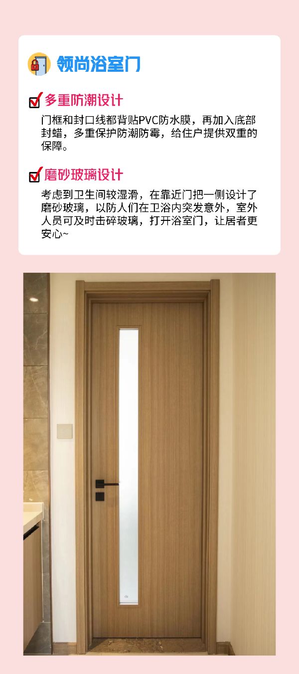 选择建议:浴室湿气常年较重,应选择具备防水性能的浴室门。另外,浴室也是意外多发地,建议挑选在门面上设有应急补救措施的门型。