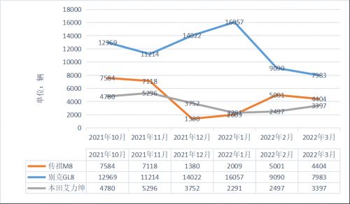 自2021年下半年以来,受到缺芯、零配件供应链等大环境因素影响,多个MPV车型度销量曲线大幅波动。别克GL8销量从1月1.6万辆跌至3月0.78万辆,呈现倒V型走势,东风本田艾力绅自去年11月起销量持续走低,3月销量为2163辆。逆境下传祺M8也曾出现不寻常的销量浮动,但随即在今年二月份变强势回升至5001辆,同比大幅攀升86.5%,划出V型逆转曲线。
