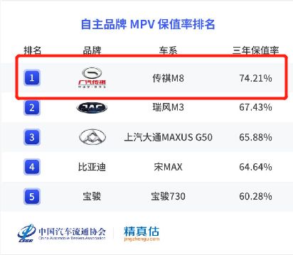 优秀的保值率也从侧面证实M8在消费者心中的地位。1月21日,中国汽车流通协会和精真估联合发布了《2021年度中国汽车保值率报告》,传祺M8以74%高保值率荣登自主品牌MPV榜单No1,也是唯一进入MPV总榜的中国豪华MPV。同时在2021年汽车之家保值率榜单和58汽车联合J.D. Power颁布的“紫檀奖·2021中国汽车保值率风云榜”上,M8稳站自主品牌MPV榜第一名。高保值率与高销量形成良性循环,使得M8豪华品质深入人心。