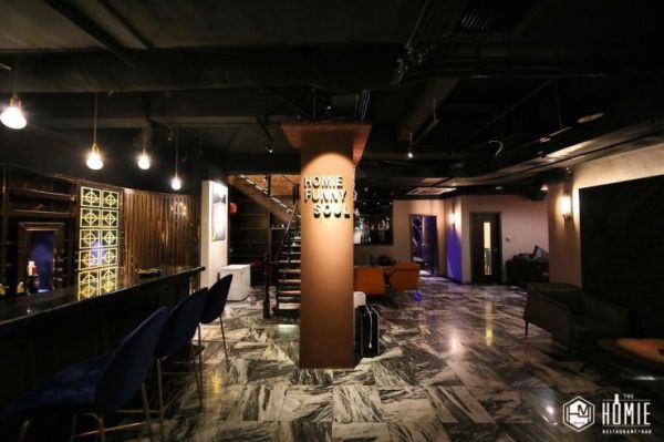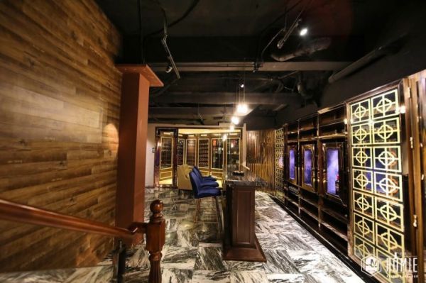 設計師在餐吧入門處的天花方面加入了特色形狀的木天花,令客戶進入餐吧時感覺舒適自然,並在餐吧的中央天花添加了些大小不一的方形燈盒,令內部天花環境增加特色,照明度亦有所增強。考慮到風水問題,業主要求在樓梯間入口設計一個屏風,設計師在屏風的另一側作中空設計,使期其變成一個餐卡坐。一方面可起到風水遮擋作用,另一方面亦增強了餐吧的容納率。在卡座的設計上,加入了造型燈光,使其成為餐吧內不可缺的特色亮點之一。為強調突出工業風格,設計師在用材上主要以原木,鐵藝及水泥作搭配,透出濃郁的現代工業氛圍,深受年輕顧客喜愛。