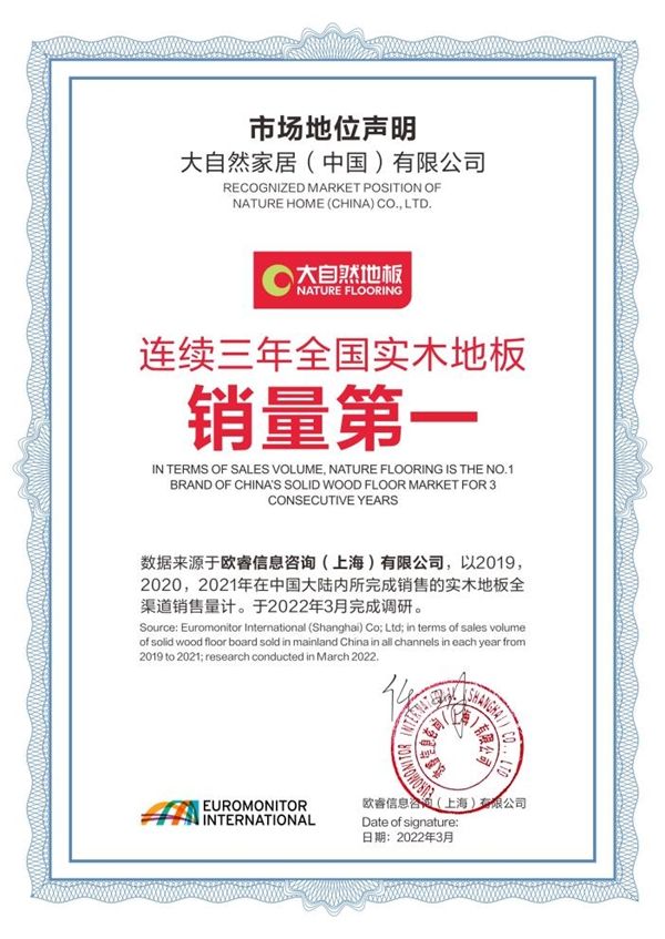 近日,据世界市场调查机构欧睿国际数据显示,在2019年-2021年期间,大自然实木地板已连续3年全国销量领先,获得了“大自然地板连续三年全国实木地板销量第一”的荣誉。大自然地板作为行业的龙头企业,再次用实力夯实了行业引领者的地位,也代表着全国用户对于大自然地板的高度认可。
