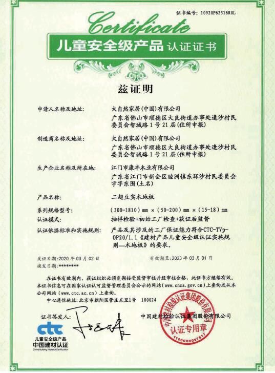 在疫情蔓延的年代,人们都对健康生活有着强烈的追求,大自然儿童安全级地板“圆盘豆实木地板”更是直击用户痛点,满足消费者需求。圆盘豆选材原木,质感天然,触感温润,健康性不言而喻;同时采用“压干法”和“钢扣固装方案”,有效解决地板变形、开裂和缝隙等问题,实现“双稳定 抗变形”的卓越性能,更获得了“儿童安全级产品认证证书”。在综合实力上,大自然实木地板不仅有实用性创新技术,更是从实际上解决用户生活需求。