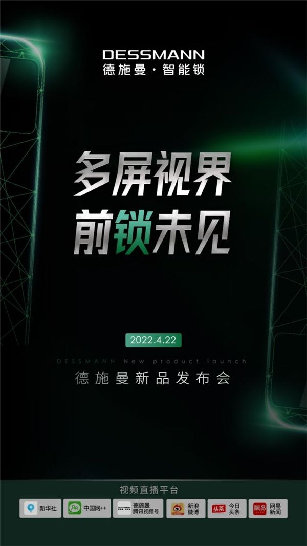 4月22日,德施曼智能锁“多屏视界 前锁未见”2022新品发布会即将召开,用户可通过新华社、中国网++、新浪微博、今日头条、网易新闻等视频直播平台以及腾讯视频号、抖音、天猫、京东等平台官方账号观看发布会。