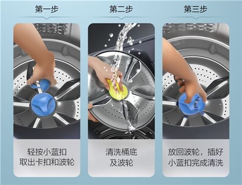TCL的独家专利技术免污小蓝扣是行业内的首个可拆洗技术,轻按小蓝扣,取出卡扣和波轮,就可以对不锈钢波轮进行冲洗,同时对桶底进行清洁,最后将波轮盘放回,插好小蓝扣,清洗工作就完成了,整个操作十分简单便捷。轻松完成三个月一小洗,轻松解决细菌滋生,让污垢无处可藏,避免衣物的二次污染!