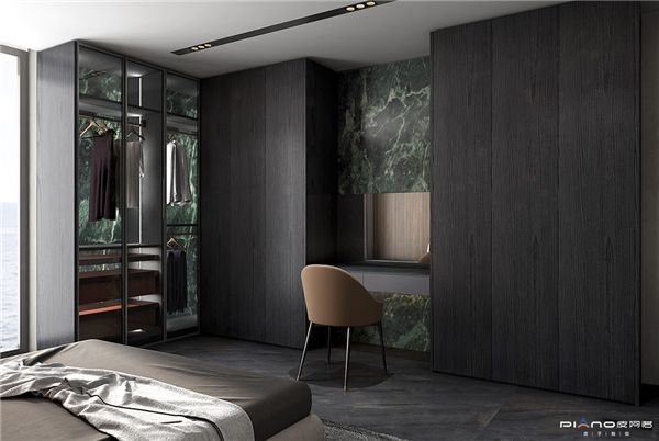 而在视觉呈现上,高端全屋定制皮阿诺从极简的概念中提取灵感,通过沉稳的深色木纹恰到好处的把握,呈现出删繁就简的简约与整洁,让卧室变得更加优雅。