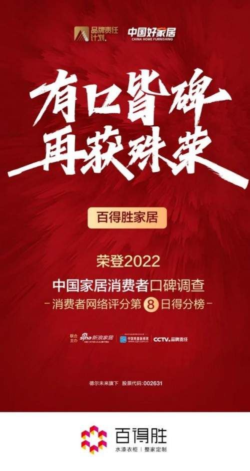 近日,新浪家居联合中国质量新闻网、CCTV品牌责任,全面开展《中国好家居——2022中国家居消费者口碑调查》活动评比,百得胜水漆整家定制荣登2022中国家居消费者口碑调查得分榜,在消费者对品牌认知、销售过程评价、安装交付、产品质量、售后服务等多个维度均取得亮眼成绩,成功打造众多环保水漆定制柜墙门一体化示范案例,成为名副其实的整家定制家居行业的口碑之选。