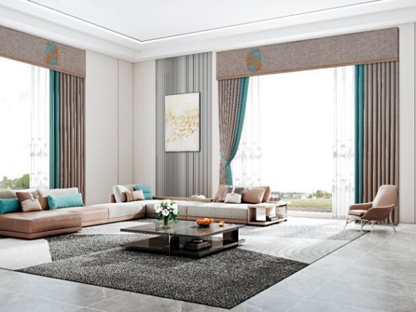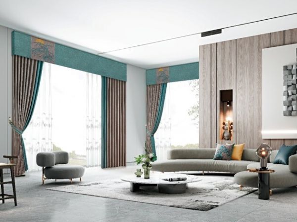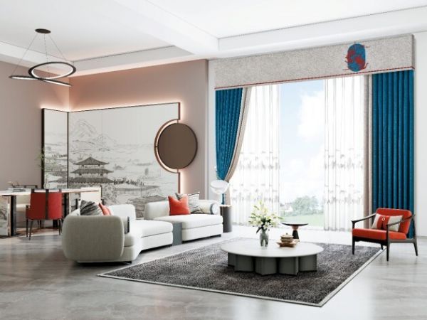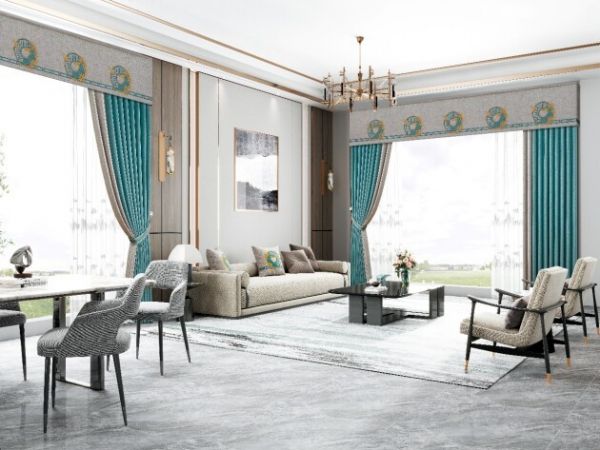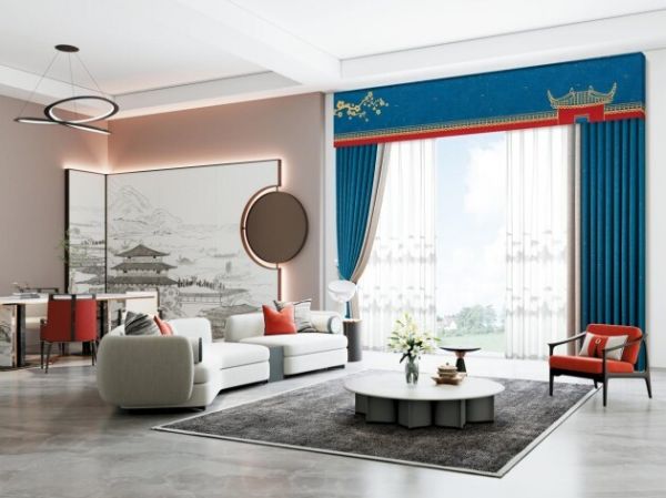 如鱼得水锦绣前程抗菌窗帘系列均选用高精密双经轴色织扁金皮提花遮光材质作为面料,幔头均采用激光雕刻工艺勾勒图案,尽显高端与品质。其中锦绣前程以勿忘我蓝为主色调,银桦色(灰色系)为辅色调,并融入具有寓意的铜钱、回纹和喜鹊、花枝元素,雅致且富有品格。