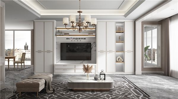 现在的电视柜除了放置影音设备外,还慢慢变成了一个收纳柜,用以收纳零食、玩具、小物件等,因此电视柜里存放的几乎都是些日常所需的杂物。皮阿诺高端全屋定制就抓住了这一点,用设计赋予电视柜丰富空间层次感的同时,用细节雕琢给予它强大的收纳功能,带来秩序与变化。