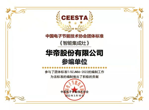 近期,中国电子节能技术协会为华帝颁授参与《智能集成灶》标准编制工作做出积极贡献荣誉证书,以表彰其在《智能集成灶》标准制定中的突出贡献。