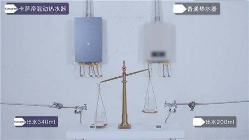 面对这类痛点,什么样的热水器能够解决呢?4月22日,卡萨帝官方平台发布一段热水器天平实验视频。视频显示,卡萨帝「混动」热水器和普通热水器在同时开启10分钟后,工作人员用两个量杯分别接10s热水放在天平上。可见,前者量杯中接出的水量多,天平朝前者倾斜。相同时间运行的热水器,为什么出水量不同?差别在于两台热水器的科技不同。