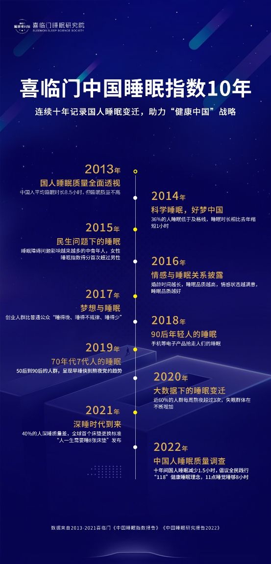 从1984年至今,喜临门经历38年积淀,始终专注于健康睡眠领域。2013年起,现今喜临门已连续10年与中国睡眠研究会、中国社会科学院等专业权威机构发布《中国睡眠指数报告》,为提高国人整体睡眠质量提供解决方案。