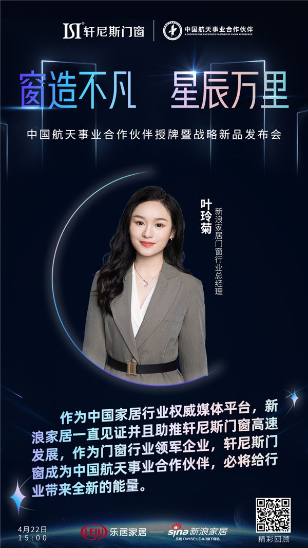 新浪门窗频道讯 4月22日,「窗造不凡·星辰万里」2022年轩尼斯门窗中国航天事业合作伙伴授牌暨战略新品发布会正式启幕。