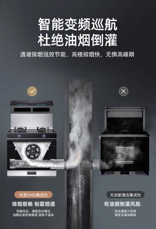 集成灶得以实现高效油烟吸净率,则是源自对吸油烟方式的改变,将传统上行排烟升级为侧吸下排,集成灶十大品牌、厨电行业十大品牌科恩S450变频大吸力左右蒸烤集成灶20m³/min澎湃大吸力,S级豪华轿车品质,低空封锁油烟升腾区,清爽爆炒不过脸,吸净双灶爆炒烟,搭载智能变频巡航系统,遇堵排烟强效节能,高楼排烟快,无惧高峰期。