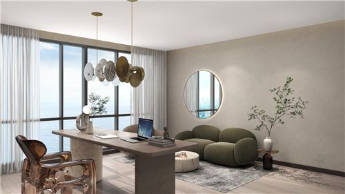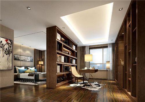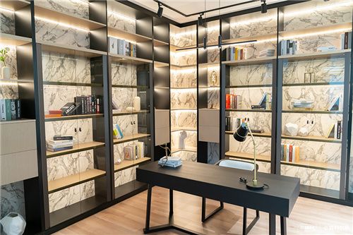我们可以在沙发背后做一个嵌入式书架,增加功能的连续性,以满足书籍与收藏品的收纳与展示功能。居此一隅,通透敞亮,办公休闲两不误。