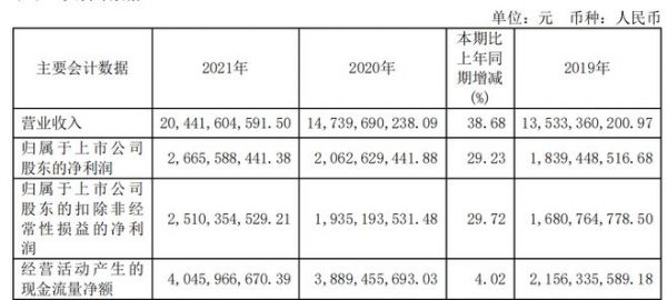 4月22日,欧派家居(603833.SH)发布2021年业绩公告。报告期内,欧派家居实现营业收入204.42亿元,同比增长38.68%,实现归属于上市公司股东的净利润26.66亿元,同比增长29.23%;归属于上市公司股东的扣除非经常性损益的净利润为25.1亿元,同比增29.72%。
