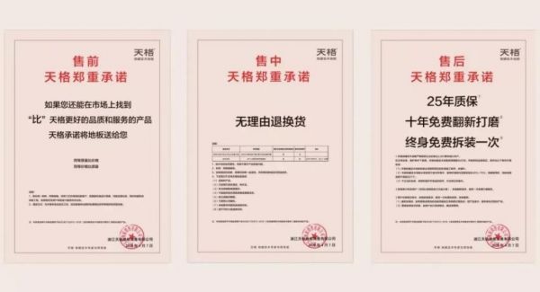 然而,地板企业也需深刻意识到:承诺不是无足轻重的营销工具,而是切切实实具有法律效力的消费权益。以天格地板为例,其之所以可以做出“五大承诺”并践行至今,背后是基于面面俱到、表里如一的产品以及“安装服务站”模式等硬实力,基于对自身产品品质与服务能力的高度自信。同样,对于刚刚推出用户承诺的大自然地板,消费者也期待企业能让承诺真正落地。
