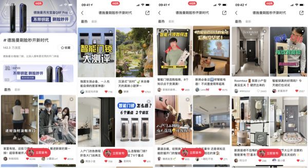 德施曼天猫大牌日期间,为了更好的连接目标用户,德施曼深度合作小红书,发起了热搜火焰话题,同时以“抢200名0元购”德施曼智能锁为核心权益,发起了#德施曼刷脸秒开新时代创意话题,并联动几十位KOL形成联盟种草矩阵,多场景强势种草用户,同时激发用户兴趣关注,自发进行话题打卡及互动。