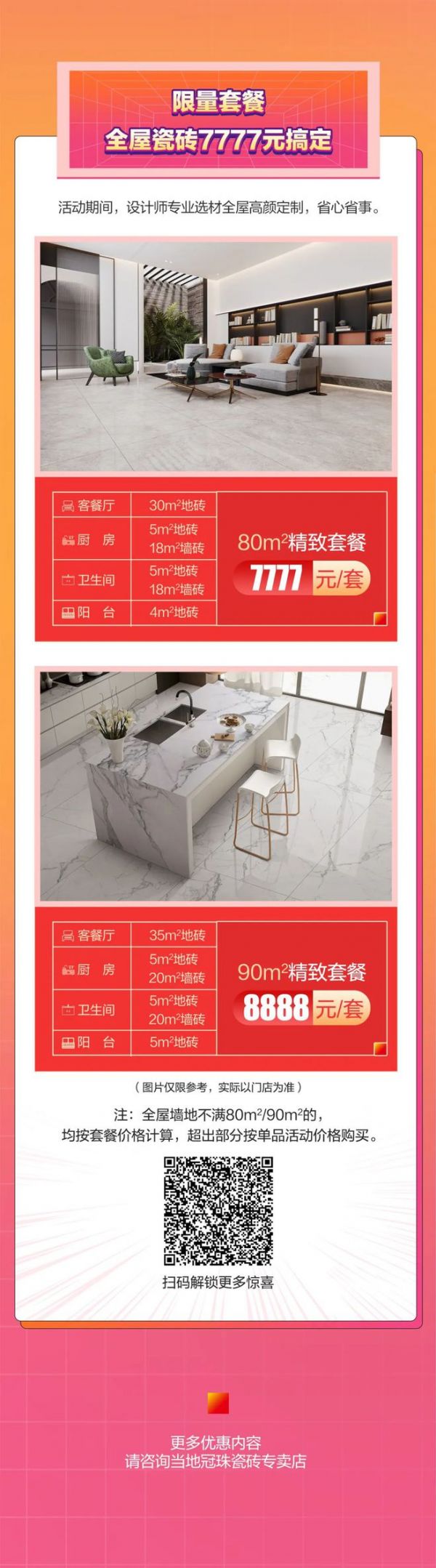 爱购冠珠,家倍美好!冠珠瓷砖520全国大促为爱献礼,4月29日至5月22日活动期间,冠珠瓷砖总部发放“520专属礼券”,每人可领券金额高达5200元,购买对应品类瓷砖可直接抵扣,数量有限,发完即止。冠珠瓷砖精选多款品质尖货,厂家直供补贴,让您省钱更省心。设计师专业选材全屋高颜定制,限量套餐震撼放价。更多省钱福利,欢迎到冠珠瓷砖各大专卖店选购。
